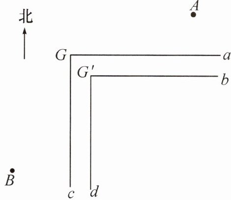 6. 如图,一条东西流向的小河在点$G$和点$G'$处直角转弯,改变为南北流向,河宽不变. $A$,$B$两地分别在河的北岸和西岸,现要分别在东西、南北流向的河上建$CD$,$EF$两座桥,桥造在何处可使从$A$地到$B$地的路径$ACDEFB$最短?并说明理由.(假设河两岸是平行线,桥与河垂直)