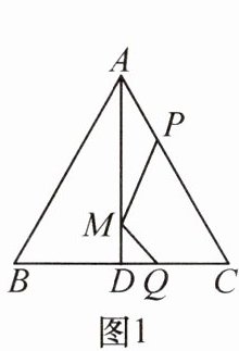 如图 1,在等边三角形$ABC$中,$D$为$BC$的中点,$P$,$Q$分别为$AC$,$BC$上的点,$AP = CQ = 2$,$DQ = 1$,$M$是线段$AD$上的动点,连接$MP$,$MQ$,求$MP + MQ$的最小值.