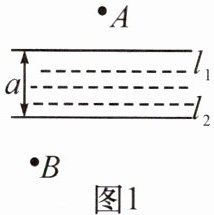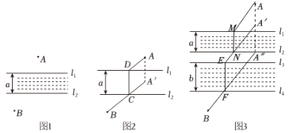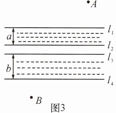 如图 3,$A$,$B$两村之间有两条互相平行的河. 一条河宽$a$,另一条河宽$b$,现欲在两条河上各造一座桥(桥必须与河岸垂直),使$A$,$B$之间的路程最短,试画出造桥位置.