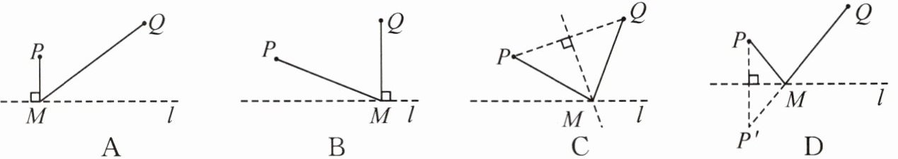 1. 如图,直线$l$是一条河,$P$,$Q$是两个村庄. 计划在$l$上的某处修建一个水泵站$M$,向$P$,$Q$两地供水. 现有如下四种铺设方案(图中实线表示铺设的管道),则所需管道最短的是(