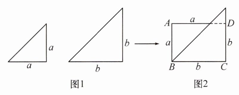 用直角边长分别为$a$和$b$的两个等腰直角三角形进行拼图,由图 1 得到图 2.