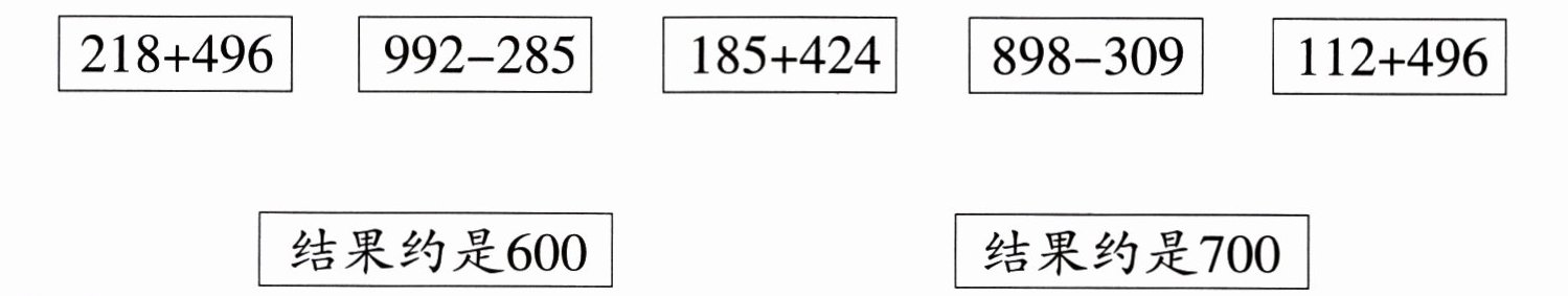 $185 + 424$、$898 - 309$、$112 + 496$ 连“结果约是$600$”。