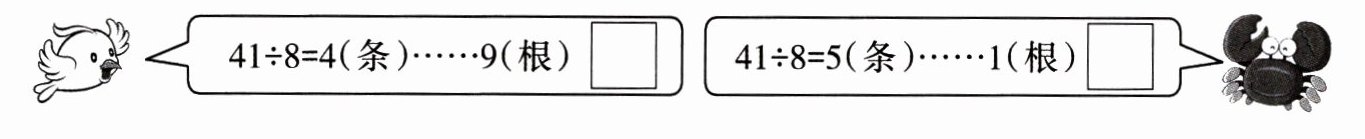 【解析】:在有余数的除法中,余数一定小于除数。第一个算式余数$9$大于除数$8$,不符合规则;第二个算式$41÷8 = 5$(条)$\cdots\cdots1$(根),余数$1$小于除数$8$,符合规则。