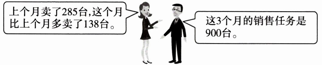 1. 先求这个月卖的台数:已知上个月卖了$285$台,这个月比上个月多卖$138$台,所以这个月卖了$285 + 138 = 423$台。