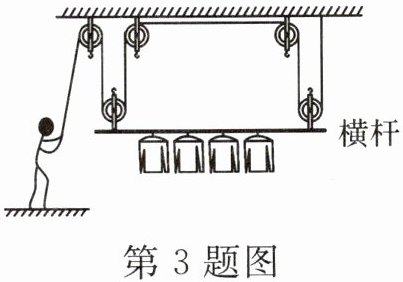 3. (2023·广安)学习了简单机械知识后,某同学自制了如图所示的晾衣架。他将 50 N 的衣物挂在横杆上,拉绳使其匀速上升 1.6 m,用时 5 s(上升过程中,横杆保持水平),此过程该装置的机械效率为 80%(不计绳重及摩擦)。下列分析正确的是 (