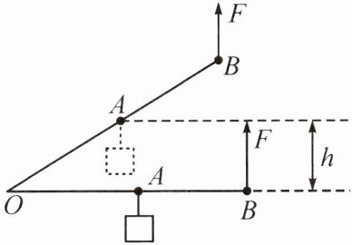 5. 如图所示,重力 $G = 5N$ 的物体挂在粗细均匀的杠杆的中点 A 处。在力 $F = 4N$ 作用下使物体匀速上升 $h = 0.6m$,已知 B 点沿竖直方向上升距离 $s = 1.2m$,不计摩擦,求: