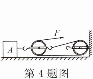 4. (2024·六安金安区期中)如图所示,是采用滑轮组水平向右移动重物的场景。已知物体 A 重为 20 N,水平滑动时受到的摩擦力为 12 N,拉力 $F = 5N$,物体 A 在 10 s 内匀速移动了 0.6 m,则滑轮组的机械效率为