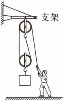 15. 如图所示,滑轮组悬挂在水平支架上,重为600N的工人站在水平地面上,竖直向下拉动绳子自由端,使重为300N的物体以0.2m/s的速度匀速上升。在这个过程中,人施加的拉力$F$为200N,两个滑轮质量相等,不计滑轮组的绳重和摩擦。求:
