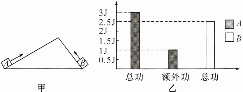 6. (2023·深圳)如图甲,$A$、$B$是两个完全相同的物体,琴琴同学分别将$A$、$B$两物体拉到斜面顶端,对物体做功情况如图乙所示,请问对物体$A$做的有用功是
