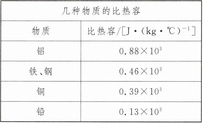 6. 某金属块质量为 $ 1.5\,kg $、温度为 $ 80^{\circ}C $,把它放在室外自然冷却,当放出 $ 6.6 × 10^{4}\,J $ 热量时,该金属块温度降低了 $ 50^{\circ}C $,该金属块的比热容是多少?可能是哪种金属?