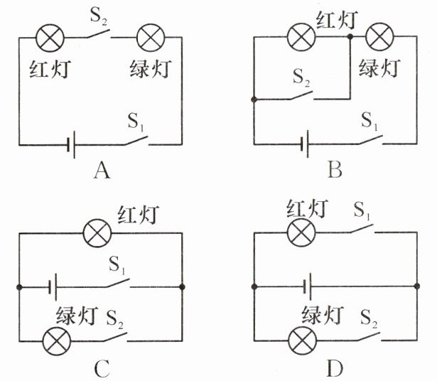 13. (2024·通辽)某交通路口指示车辆通行的信号灯由红灯和绿灯组成,红灯停,绿灯行,以下是红、绿灯工作时的电路简图。你认为正确的是(
