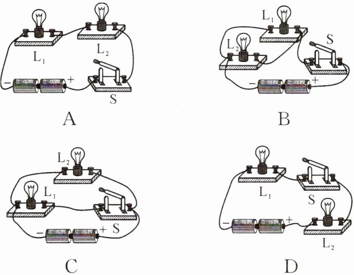 9. 如图所示的电路中,开关能够同时控制两盏灯,且两灯发光情况互不影响的电路是(