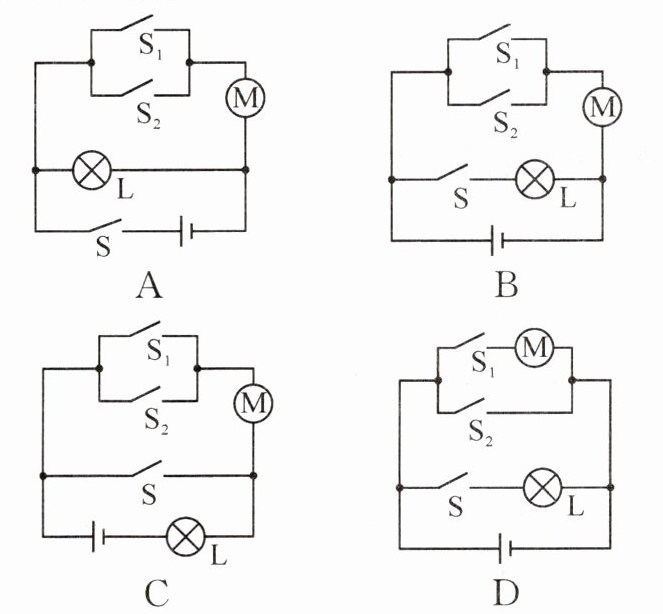 12. 为了加强校园安全,安徽省部分学校启用智能门禁系统。当师生进行人脸识别(开关 $ S_{1} $ 闭合)或刷校园卡(开关 $ S_{2} $ 闭合)时,闸机(用 $ M $ 表示)均能打开,且在光线较暗时,光敏开关 $ S $ 自动闭合,补光灯 $ L $ 发光,在光线较亮时,光敏开关 $ S $ 自动断开。下列电路图符合上述要求的是 (