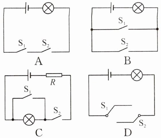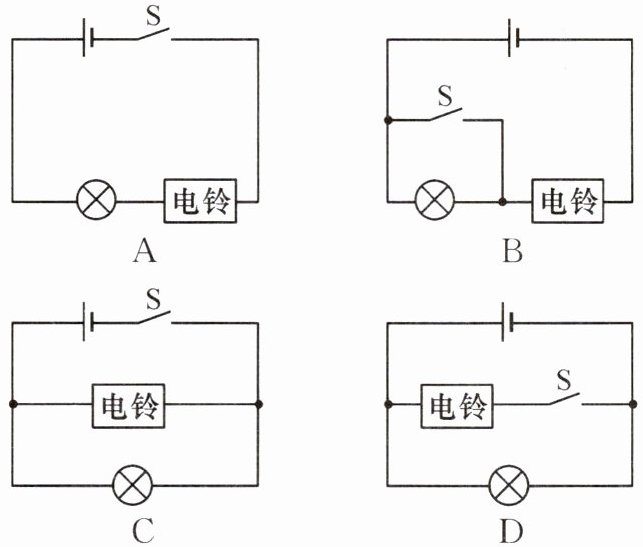9. (2024·天津)某兴趣小组要为居家老人设计一个“应急呼叫器”电路,要求:开关断开时,电灯和电铃均不工作;开关闭合时,灯亮铃响,即使电灯因开路不亮,电铃仍可工作。如图所示的电路中,符合设计要求的是 (