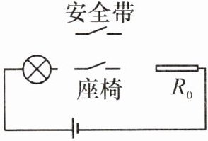 14. 汽车的座椅和安全带插口相当于开关,人坐在座椅上时,座椅开关闭合,指示灯亮;将安全带插入插口时,插口开关闭合,指示灯又熄灭。请将如图所示的元件连接成一个符合要求的电路图。(其中的电路元件 $ R_{0} $ 在安全带开关闭合时,可以防止电路短路)