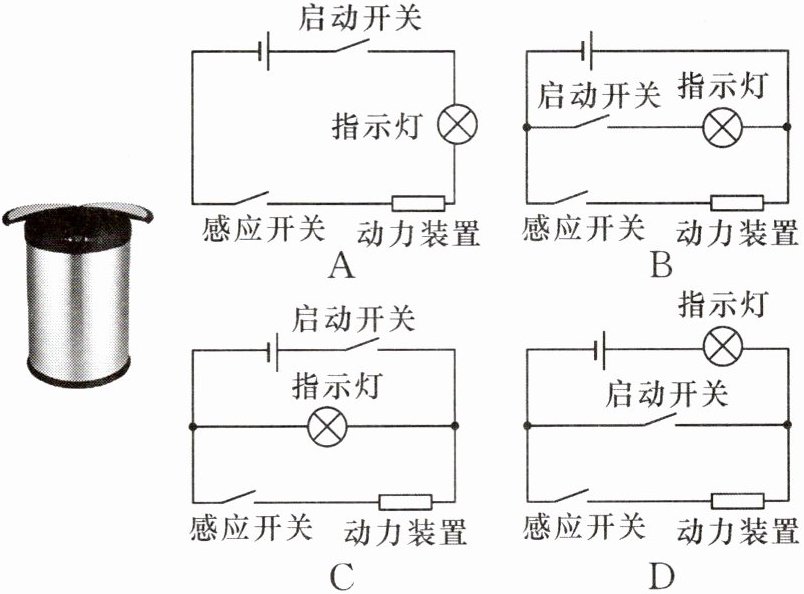 10. (2024·池州期中)某款感应式垃圾桶如图所示。其工作原理如下:启动开关闭合后,垃圾桶才能正常使用,此时指示灯亮起;扔垃圾时只需将手伸到感应区上方一定距离内,感应开关自动闭合,动力装置工作,垃圾桶盖缓缓打开;手离开 $ 5 \, s $ 后动力装置会控制桶盖闭合,然后感应开关自动断开。下列电路符合要求的是 (