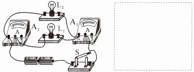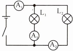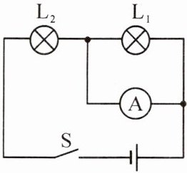 测的是通过灯 L₁ 的电流,电流表$A_{2}$