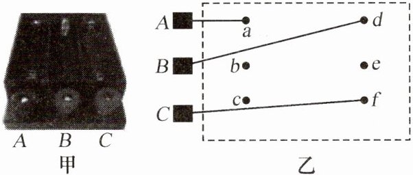 13. 如图甲所示的电池盒,盒外有三个接线柱 $A$、$B$、$C$;盒内有三个 $5$ 号电池插槽,六个接线柱 $a$、$b$、$c$、$d$、$e$、$f$;部分连接好的导线已画出,如图乙中所示。选接盒外不同接线柱,可从该电池盒获得 $1.5$ V、$3$ V、$4.5$ V 三种输出电压。请你在图乙的虚线框内,用笔画线代替导线将三节干电池(用元器件符号表示)连接起来,组成一个符合实际的电源,并满足上述要求。