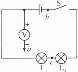 11. 如图所示,电源电压保持不变,$a$ 是从电压表的负接线柱引出的导线接头。$a$ 与 $b$ 处相接时,电压表示数为 $6.0$ V;使 $a$ 与 $b$ 处断开,然后与 $c$ 处相接,闭合开关 $S$ 后,电压表示数为 $4.5$ V,这时灯泡 $L_2$ 两端的电压为