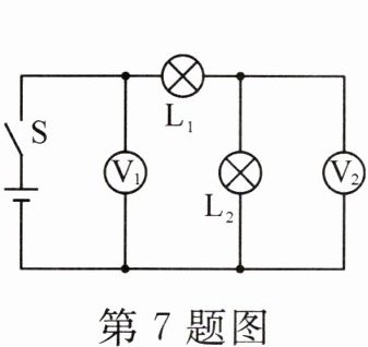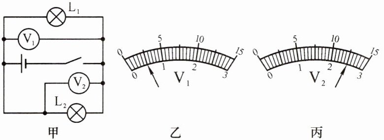 9. 如图甲是测量电压的电路图,闭合开关时,图乙、丙是两个电表指针的指示情况,则 $L_1$、$L_2$ 两端的电压分别是(