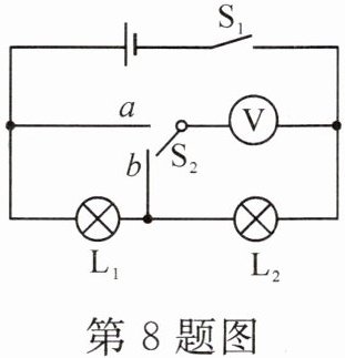 8. 如图所示的电路中,闭合开关 $S_1$,开关 $S_2$ 接到 $a$ 时,电压表示数为 $9$ V,开关 $S_2$ 接到 $b$ 时,电压表示数为 $4$ V,下列说法错误的是(