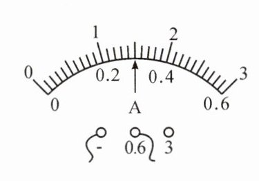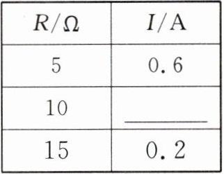 (4) 小明先用 $ 5\Omega $ 的电阻进行实验,测出一组数据填入下表后,再用 $ 10\Omega $ 的电阻替换 $ 5\Omega $ 的电阻接入电路,闭合开关,调节滑动变阻器,当电压表示数为 $ 3\ V $ 时,电流表指针位置如图所示,将电流表示数填入下表中。