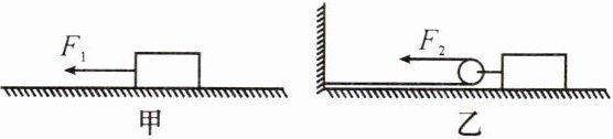 10. 甲图中用力$F_{1}$水平拉着重为$G$的物体在水平路面上匀速移动距离$s$,乙图中用动滑轮拉着同一物体在同一水平路面上匀速移动距离$s$,水平拉力为$F_{2}$,则在使用动滑轮的过程中(
