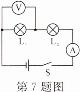 7. 如图所示,开关闭合,两个灯泡都发光,突然,一个灯泡熄灭,两个电表一个示数变大,一个示数变小,则该电路故障可能是(