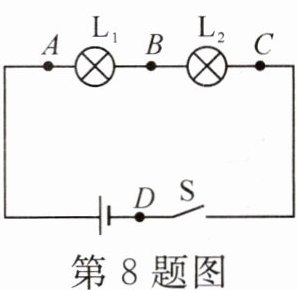 8. 如图所示,小明在探究串联电路电流规律实验中,闭合开关后,两灯均不亮,他用一个电流表检测电路故障。当电流表接 A、B 两点时两灯均不亮;当电流表接 B、C 两点时,有一盏灯亮了,产生这一现象的原因可能是(