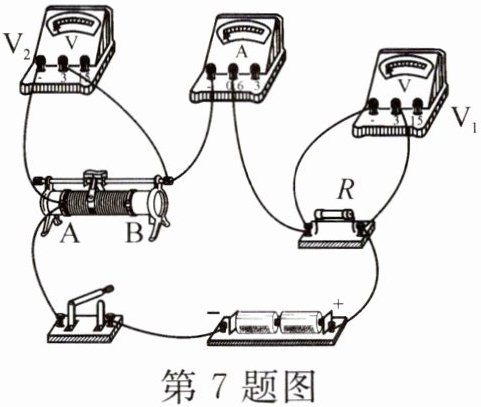 7. (2024·安徽)如图所示的电路中,电源两端电压保持不变,R 为定值电阻。闭合开关,在保证电路元件安全的前提下,将滑动变阻器的滑片由 B 端滑到 A 端,电压表 $ V_{1} $、电压表 $ V_{2} $、电流表 A 示数变化量的绝对值分别为 $ \Delta U_{1} $、$ \Delta U_{2} $、$ \Delta I $。则 (