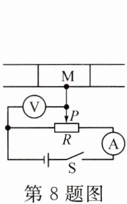 8. (2024·滁州天长市三模)计算机鼠标内装有自动控制传感器,其工作原理电路如图所示。物体 M 在导轨上左右移动时,可带动与之相连的滑动变阻器滑片 P 左右移动,通过电压表示数变化可反映出物体 M 移动的距离。当物体 M 向左移动时 (