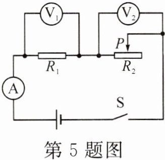 5. (2024·达州)如图所示,$ R_{1} $ 为定值电阻,$ R_{2} $ 为滑动变阻器,电源电压保持不变,闭合开关 S,滑动变阻器的滑片 P 向右移动的过程中,下列说法正确的是 (
