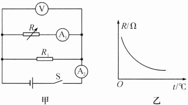14. (2023·黄冈)如图甲所示电路。电源电压恒定不变,$ R_{1} $ 是定值电阻,R 是热敏电阻,其阻值 R 与温度 t 的关系如图乙所示。开关 S 闭合,热敏电阻温度升高时,下列说法正确的是 (