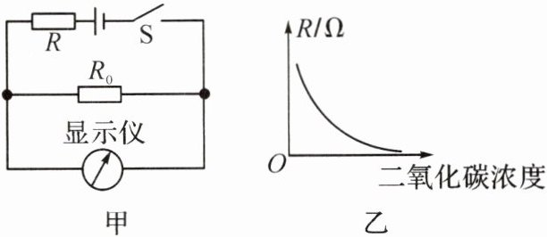 12. (2024·合肥长丰县一模)教室长时间密闭会导致室内二氧化碳浓度上升,从而影响学生的听课效率。如图甲所示,这是某科技小组设计的检测二氧化碳浓度的电路原理图,电源电压保持不变,$ R_{0} $ 为定值电阻,R 是检测二氧化碳浓度的气敏电阻,其阻值与二氧化碳浓度的关系如图乙所示。闭合开关 S,当二氧化碳浓度变大时 (