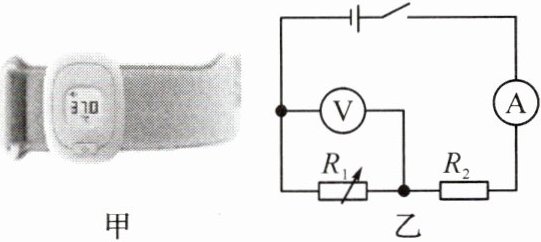 13. (2024·蚌埠蚌山区二模)如图甲为某穿戴式儿童电子温度计,其工作原理如图乙所示,电源电压恒定,$ R_{1} $ 为热敏电阻,其阻值随温度的升高而减小,$ R_{2} $ 为定值电阻。闭合开关,当温度升高时,下列分析正确的是 (