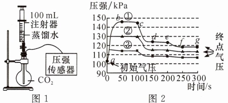 12. 新考向 数字化实验某小组利用图1装置研究25℃时二氧化碳的溶解性。打开弹簧夹,向3个充满二氧化碳的100mL烧瓶中,分别注入20mL、40mL、60mL蒸馏水,关闭弹簧夹,振荡前后压强的变化如图2。下列说法不正确的是(