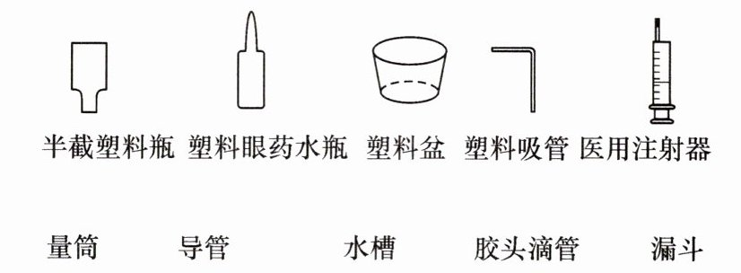 半截塑料瓶-漏斗;塑料眼药水瓶-胶头滴管;塑料盆-水槽;塑料吸管-导管;医用注射器-量筒