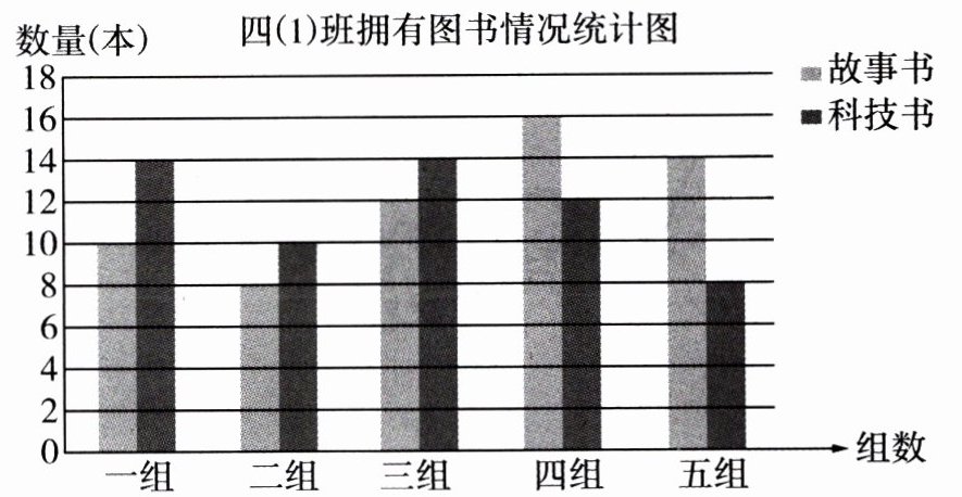 (1)观察统计图,故事书一组$10$本,二组$8$本,三组$12$本,四组$16$本,五组$14$本;科技书一组$14$本,二组$10$本,三组$14$本,四组$12$本,五组$8$本。
