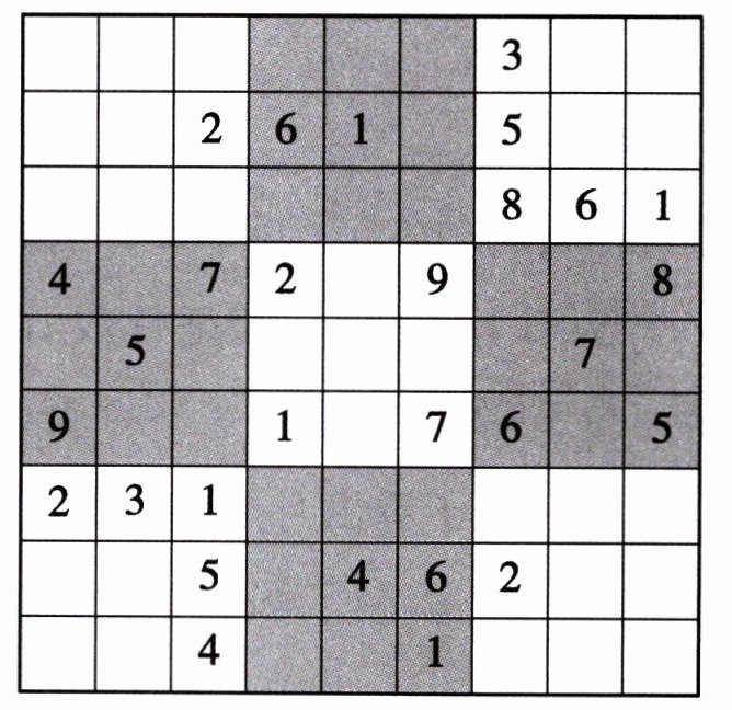 游戏规则:大正方形的每一行、每一列及每一个小九宫格里均必须包括1~9的每一个数字。