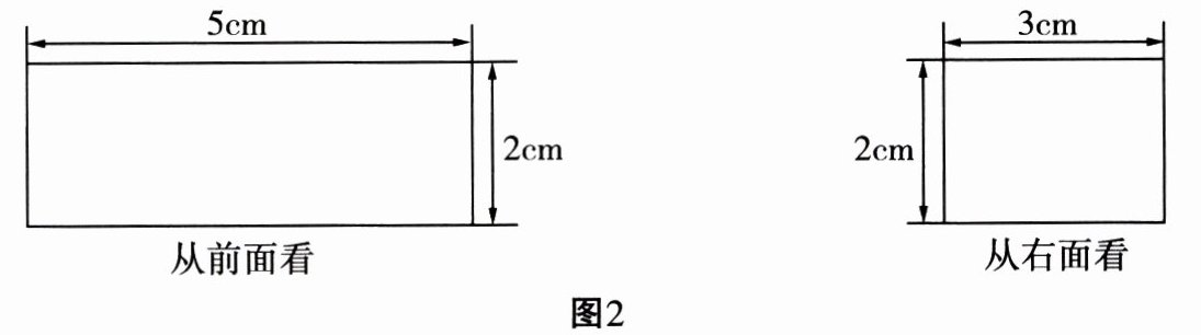 首先,根据从前面看和从右面看的形状可知,长方体的长是$5cm$,宽是$3cm$,高是$2cm$。