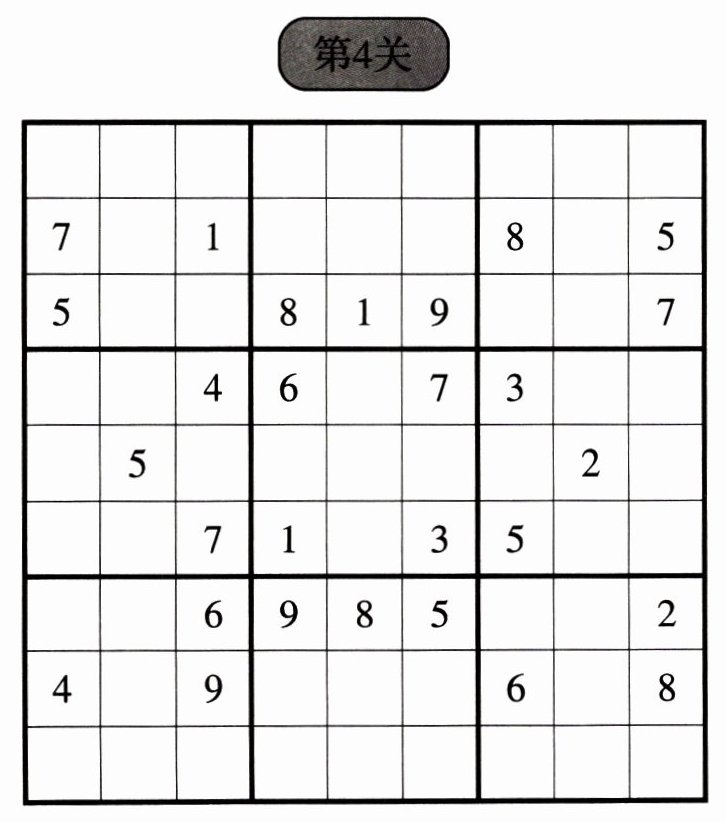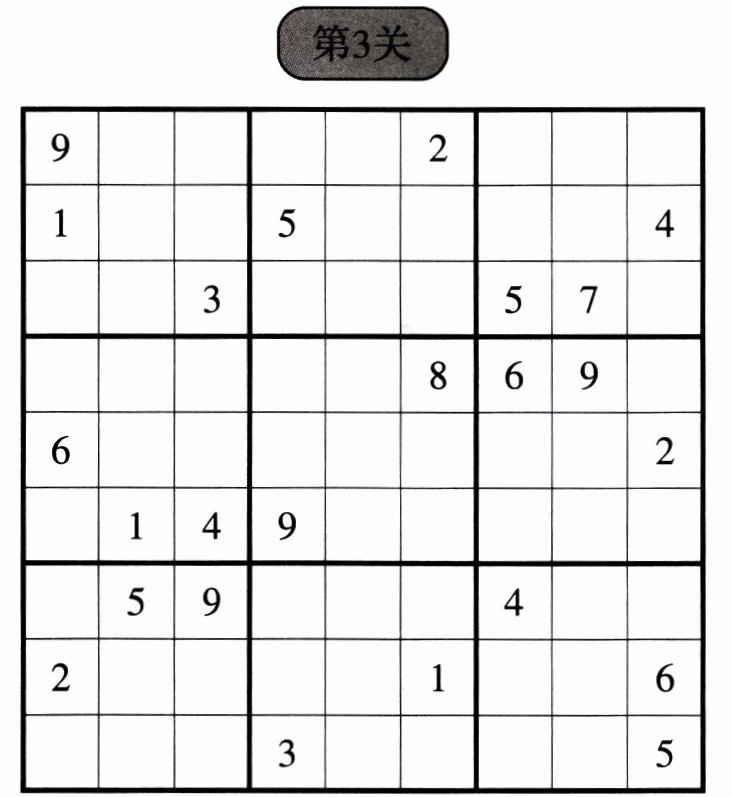 利用逻辑和推理,在空格上填入1~9的数字。使1~9每个数字在每一行、每一列和每一宫中都只出现一次。