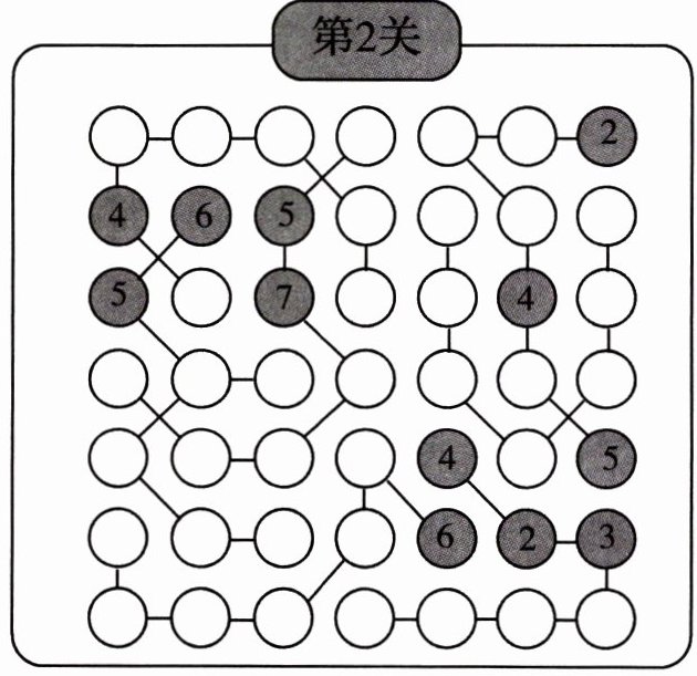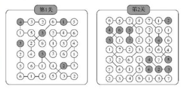 游戏规则:利用逻辑和推理,在圆圈中填入数字,使1~6(第1关)、1~7(第2关)每个数字在每一行、每一列和每一个连线中都只出现一次。