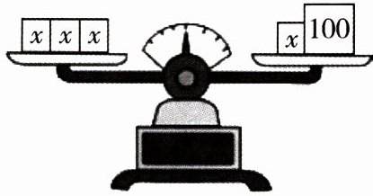 【解析】:根据天平平衡原理,左边$3$个$x$的重量等于右边$x$与$100$的重量之和,可列方程$3x = x + 100$。
