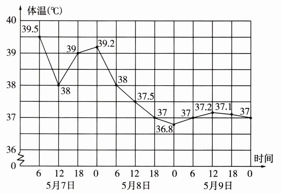 (3)体温下降快慢看折线斜率,$5$月$7$日$6$时到$12$时折线斜率最大,所以这段时间下降最快;$5$月$8$日$18$时到$5$月$9$日$0$时折线比较平缓,所以这段时间体温较稳定。
