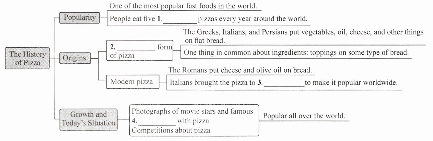 3.【教材原句】Later, Italians brought the pizza to America, and then it became a popular food all over the world, with different pizzas from different places. 后来,意大利人把披萨带到了美国,然后披萨成了一种在全世界都很受欢迎的食物,有着来自不同地方的各式各样的披萨。