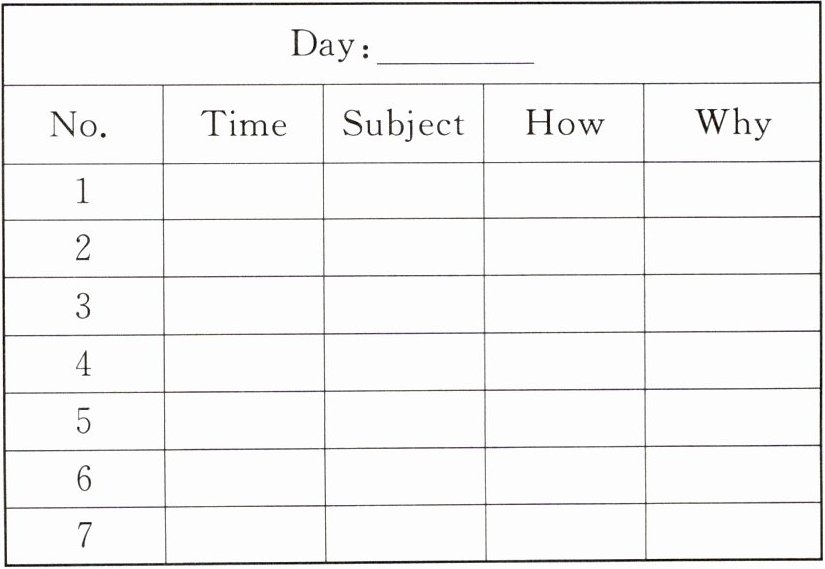 Day: Monday| No. | Time | Subject | How | Why || 1 | 8:00-8:40 | English | interesting | I like speaking English. || 2 | 8:50-9:30 | Math | difficult | It has many numbers. || 3 | 9:40-10:20 | Chinese | easy | I like reading stories. || 4 | 10:30-11:10 | History | boring | It has many dates. || 5 | 14:00-14:40 | Geography | fun | I like maps. || 6 | 14:50-15:30 | Music | relaxing | I like singing songs. || 7 | 15:40-16:20 | P.E. | exciting | I like playing basketball. |