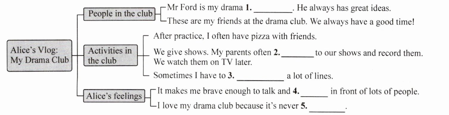 1. drama club 2. have great ideas 3. have a good time 4. in front of... 5.查看;看一下 6.不再