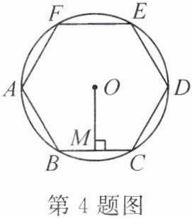 4. 如图,正六边形 $ABCDEF$ 内接于 $\odot O$,半径为 4,则圆心 $O$ 到 $BC$ 的距离 $OM$ 为(