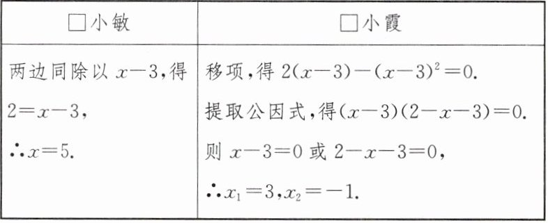 答:移项,得$2(x-3)-(x-3)^{2}=0$.提取公因式,得$(x-3)(2-x+3)=0$.则$x-3=0$或$2-x+3=0,\therefore x_{1}=$$3,x_{2}=5.$