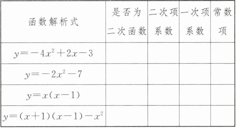 4. 判断下列函数是否为二次函数,若是二次函数,分别写出它们的二次项系数、一次项系数和常数项.